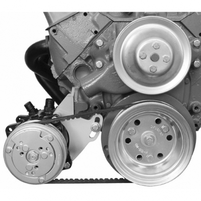 Low A/C bracket that mounts on the passenger side of a Small Block Chevy with short water pump. This bracket is designed for vehicles without much clearance below the pulleys. Due to the width of the fuel pump boss, it requires more space to the side than our 106R. You must use an electric fuel pump. This bracket mounts the A/C almost even with the crank pulley.
