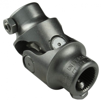 Borgeson u-joints are machined in our factory on state of the art CNC equipment from solid billet steel, stainless steel or aluminum. Ongoing engineering and testing ensures our components meet or exceed current automotive production vehicle requirements. Any of our 4 Double D (a round shaft with two flats) sizes, 14 different spline size yokes, and the ‘94 and later Mustang V style can be combined to mate components from many different manufacturers. They operate at angles up to 35°. For example, with our components, you could easily connect a GM column to a new Mustang rack and pinion or a Ford column to a Saginaw box. Similar to OEM u-joints, the staked needle bearing caps prevent loosening and adjustment malfunction.