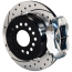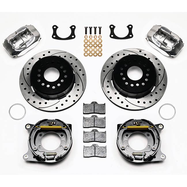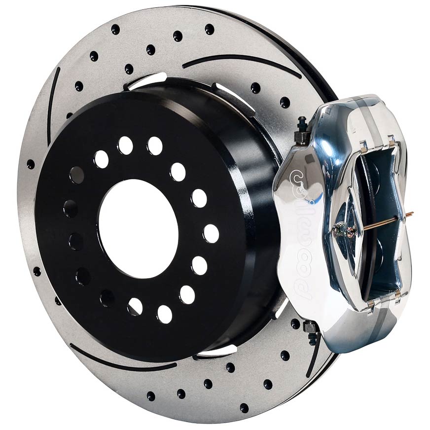 This group of FDL Pro-Series rear disc kits provides a complete solution for popular muscle car rear axles that require a parking brake. Forged billet Dynalite four piston calipers, 12.19” one-piece drum/rotors, and high friction pads provide optimized and balanced braking for all types of custom performance street/strip and show machines. The neatly hidden internal shoe system provides a clean installation with superior static holding power for parking. Optional caliper finishes and rotor designs enable the you to personalize the>