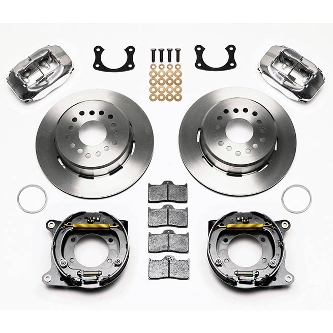 This group of FDL Pro-Series rear disc kits provides a complete solution for popular muscle car rear axles that require a parking brake. Forged billet Dynalite four piston calipers, 12.19” one-piece drum/rotors, and high friction pads provide optimized and balanced braking for all types of custom performance street/strip and show machines. The neatly hidden internal shoe system provides a clean installation with superior static holding power for parking. Optional caliper finishes and rotor designs enable the you to personalize the>