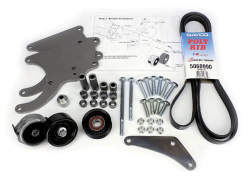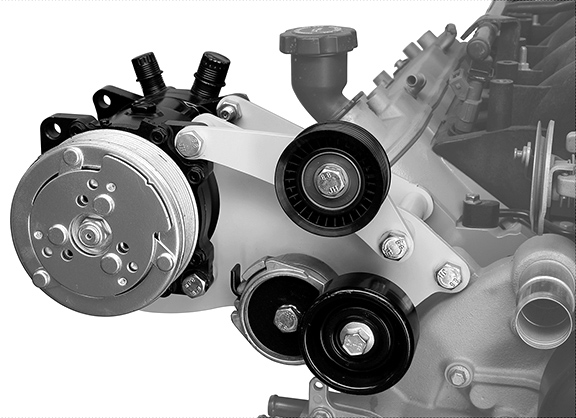 This bracket system is designed to mount an aftermarket Sanden A.C. compressor to the popular LS1 Camaro Firebird engines utilizing the factory alternator and power steering pump accessories. Bolts to head and water pump. Works well in vehicles with low hood clearance -- Trucks, 50-60’s cars, etc. Bracket kit includes: Steel A.C. mounting brackets, mounting hardware, idler bracket and pulley, heavy duty automatic belt tensioner, Dayco six-rib drive belt and illustrated instructions for easy installation.