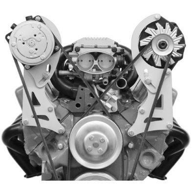 This bracket system is similar to the 228L, but sits about 1 in. higher to clear valve covers up to 4 1/2 in. tall when used with 1986 or earlier heads or 3 3/4 in tall center bolt valve cover on 1987 and up heads. Bolts to the heads and water pump.