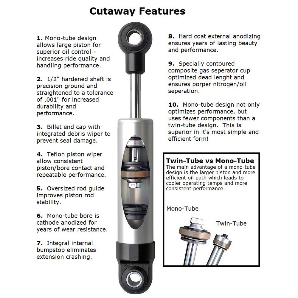 Nothing influences how your car rides and handles more than its shock absorbers. Their primary function is to control the oscillations of your car's springs thereby keeping your tires in contact with the road. To best accomplish that objective, RideTech shock absorbers utilize mono tube design which allows for a larger piston and more precise valving. The design is superior twin tubes shocks with respect to damping and reliability. These HQ Series Shocks are rebound adjustable shock absorbers and offer exceptional quality thanks to impact forged, hard anodized bodies and heavy duty shafts. They carry a 1,000,001 mile warranty. RideTech offers this HQ Series Universal HQ Series Shock Absorber with rebound adjustment and are sold each. Smooth body shocks are specifically developed to fit into a variety of stock shock or custom locations. They provide a great way to improve ride quality without reworking an entire suspension design.