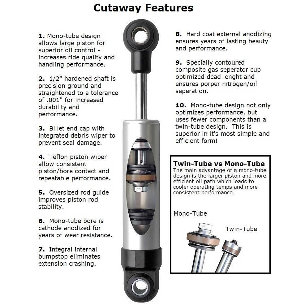 Nothing influences how your car rides and handles more than its shock absorbers. Their primary function is to control the oscillations of your car's springs thereby keeping your tires in contact with the road. To best accomplish that objective, RideTech shock absorbers utilize mono tube design which allows for a larger piston and more precise valving. The design is superior twin tubes shocks with respect to damping and reliability. These HQ Series Shocks are rebound adjustable shock absorbers and offer exceptional quality thanks to impact forged, hard anodized bodies and heavy duty shafts. They carry a 1,000,001 mile warranty. RideTech offers this HQ Series Universal HQ Series Shock Absorber with rebound adjustment and are sold each. Smooth body shocks are specifically developed to fit into a variety of stock shock or custom locations. They provide a great way to improve ride quality without reworking an entire suspension design.
