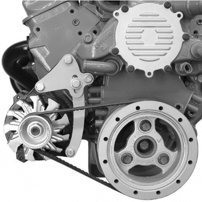 This bracket mounts the alternator low on the passengers side of the engine. Works well where only an alternator will be used and allows clearance for spark plug wires. This bracket will work on all LT-1 engines by using a 2 1/8" thick Corvette balancer and a G.M. CS130 alternator with the 6 & 10 o'clock mounting points.