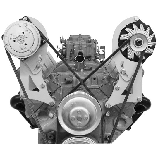A very versatile street rod style bracket system. Works well with most induction systems. Will clear multiple carbs, fuel injection, etc. Bolts to the head and top water pump bolt holes. Will fit all 1969 and newer heads including the popular Vortec heads. Will clear up to 3 in. tall center bolt valve covers when used on 1987 and later heads. Will clear up 3 3/4 in. tall valve covers when used on 1986 and earlier heads.