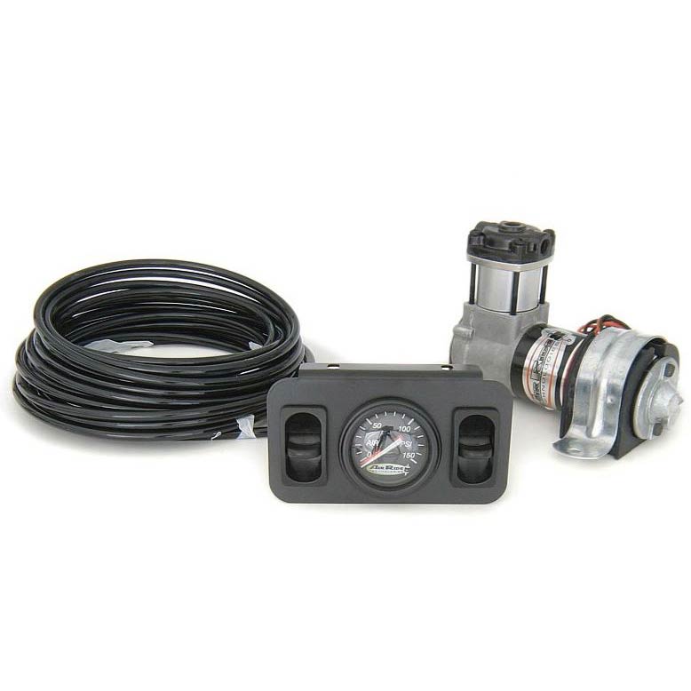 RideTech offers this small overload style compressor system that is used mainly for AirOverLeaf, ATV, or overload type applications where speed is not important. No tank needed. This system includes a dual control panel, this allows you the ability to adjust both air springs independently.