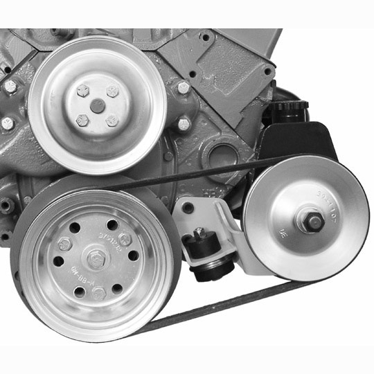 This combination front motor mount and power steering pump bracket is designed specifically for 55-57 Chevy passenger cars and 55-59 trucks. Designed for use with the non-metric Chevrolet Saginaw power steering pumps with attached reservoir and short water pump, this bracket allows clearance for the alternator belt no matter where the alternator is mounted. It directly replaces the original driver's side motor mount bracket and will work with the large 8 in. balancer. Requires the use of a 1958 or later block with the side motor mount bosses. Not for use on vehicles that have been converted to side motor mounts.