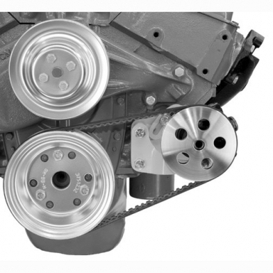 This bracket is designed to be used with the metric GM remote reservoir Type 2 pump. Bracket system is designed to work with Street Rod Style alternator bracket 238L and mounts the pump high enough to clear most chassis components. Will work with readily available small block short water pump pulleys