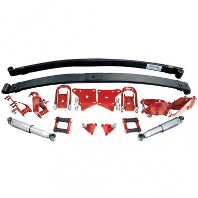 Bolt-in rear leaf kit lowers trucks 4" and features leaf springs, shock kit, frame bracket, u-bolts, axle brackets, shackles with polyurethane bushing and hardware.