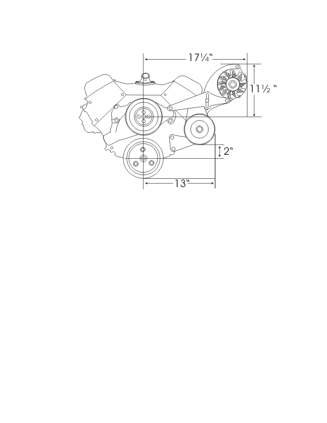 Bracket system is designed for big block Chevelle's using the SHORT WATER PUMP only. Brackets bolt to top water pump bolt, two points on the outer cylinder head and two bottom holes of drivers side engine block. Will clear up to 3" tall valve cover. Air conditioning Bracket Sold Separately Part #118R