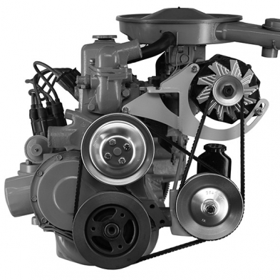This bracket is designed for the 1963-74 Chevy 230/250 C.I.D. 6 cylinder engine to mount a standard case GM alternator and a Saginaw power steering pump with early attached reservoir. Works with factory single groove balancer and water pump pulley. A two groove power steering pump pulley will be required for this application to drive the alternator.