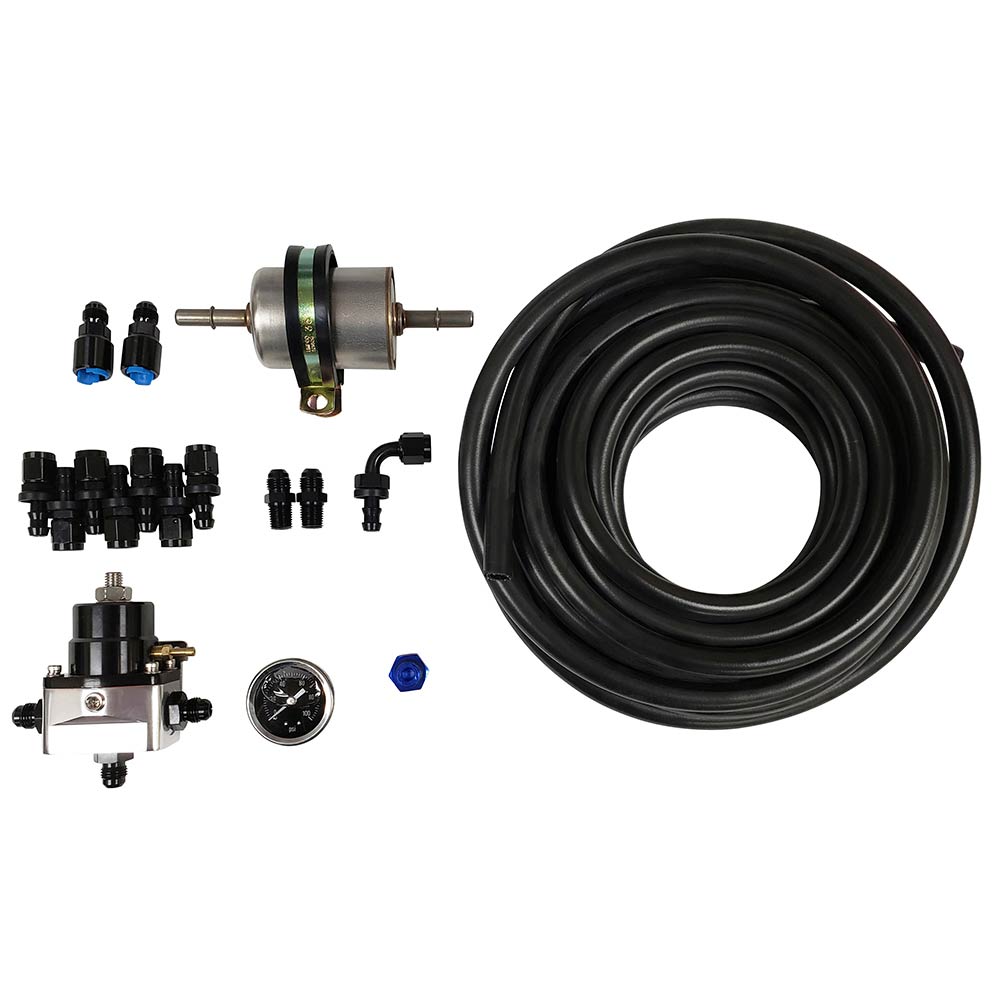 This fuel line kit includes 25 feet of hose and the fittings that you need to connect a Tanks Inc. fuel pump to a fuel injected engine. The fuel pressure regulator is adjustable from 35-70 PSI and compatible with fuel pumps up to 400 LPH.
