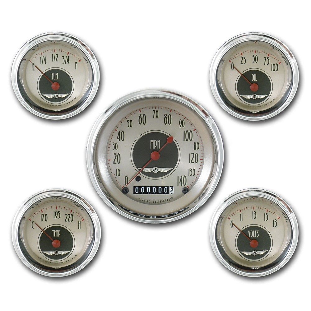 This All American Nickel 5 Gauge Set includes 3-3/8" Speedo & 2-1/8" Fuel, Oil, Temp & Volts. Features a Nickel Face, Brown Numbers, Polished Stainless High Step Bezel finish, Curved Glass Len & Red Pointers that give these gauges a classic finish for your hot rod.