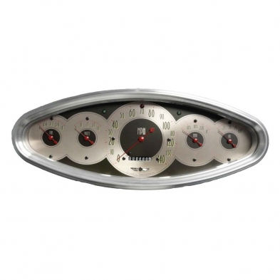 This All American Nickel 5 Gauge Package that includes Speedo, Fuel, Oil, Temp & Volt gauges. Features a Nickel Face, Brown Numbers, Polished Stainless Finished High Step Bezel, Curved Glass Len & Red Pointers that give these gauges a classic finish for your hot rod.