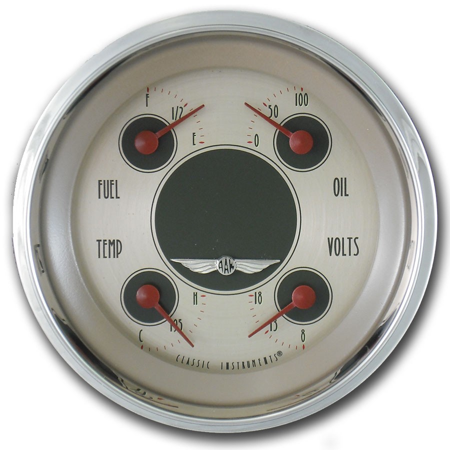 This All American Nickel 3-3/8" Quad gauge. Features a Nickel Face, Brown Numbers, Polished Stainless Finished High Step Bezel, Curved Glass Len & Red Pointers that give these gauges a classic finish for your hot rod. Please note this Quad gauge will require senders for Water & Temp gauge that are not included.