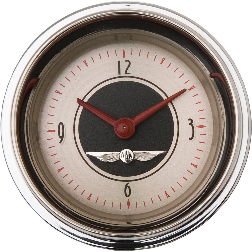 This All American Nickel 2-1/8" Clock. Features a Nickel Face, Brown Numbers, Polished Stainless Finished High Step Bezel, Curved Glass Len & Red Pointers that give these gauges a classic finish for your hot rod.
