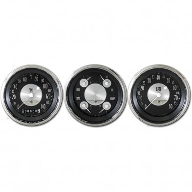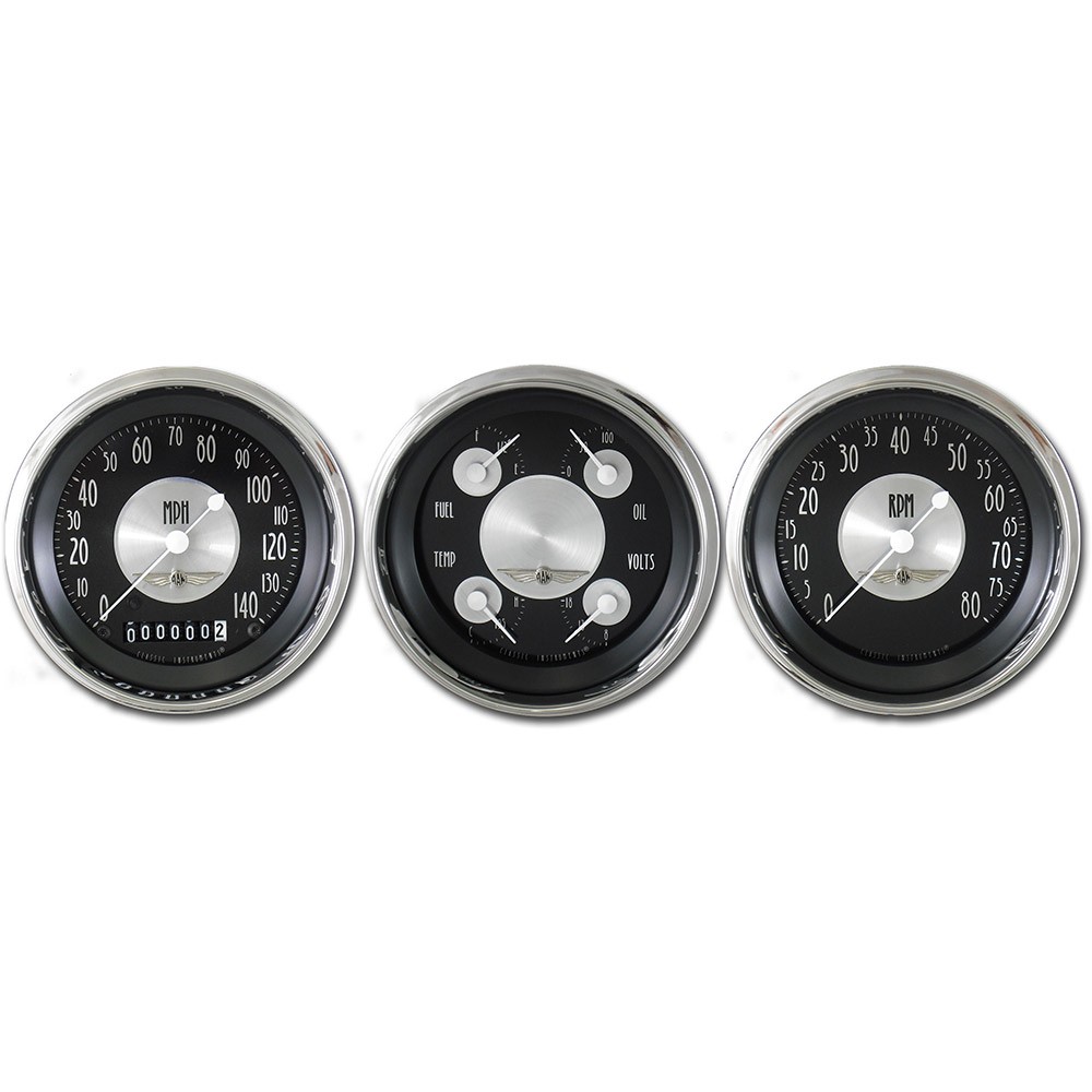 This All American Tradition 3 Gauge Set includes 3-3/8" Speedo, Tach & Quad Gauges. Features a Black Face, White Numbers, Polished Stainless High Step Bezel finish, Curved Glass Len & White Pointers that give these gauges a classic finish for your hot rod.