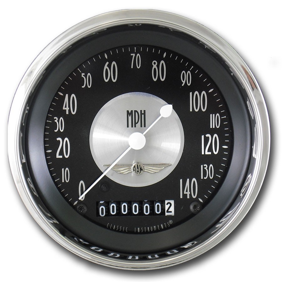 This All American Tradition 3-3/8" Speedo Gauge. Features a Black Face, White Numbers, Polished Stainless High Step Bezel finish, Curved Glass Len & White Pointers that give these gauges a classic finish for your hot rod. Please note this gauge may requires a pulse signal gemerator that is not included.