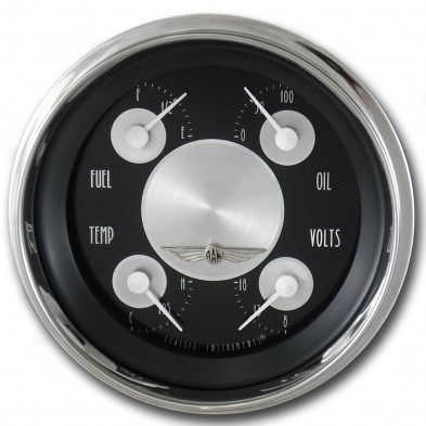 This All American Tradition 3-3/8" Quad Gauge. Features a Black Face, White Numbers, Polished Stainless High Step Bezel finish, Curved Glass Len & White Pointers that give these gauges a classic finish for your hot rod. Please note this gauge with requires a Oil & Temp senders that is not included.