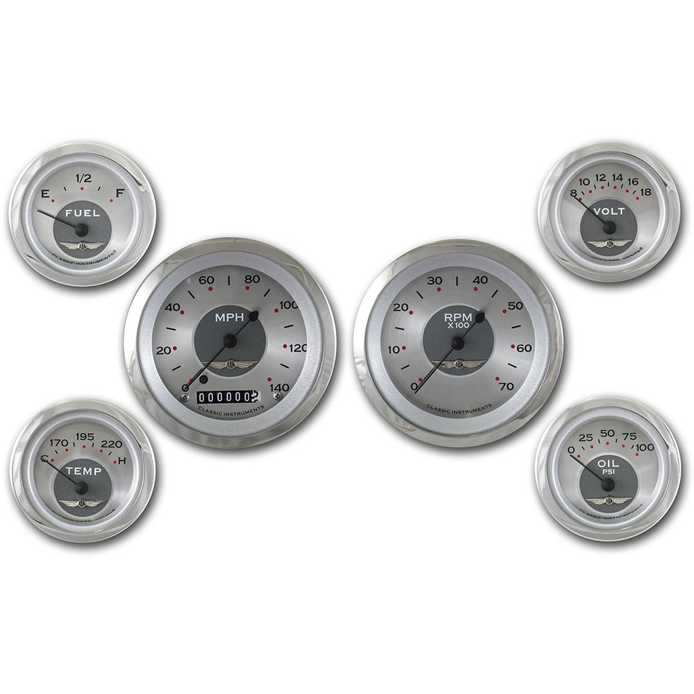 This All American 6 Gauge Set includes 3-3/8" Speedo, Tach & 2-1/8" Fuel, Oil, Temp & Volts. Features a Silver Face, Black Numbers, Polished Stainless Radial Bezel, Curved Glass Len & Black Pointers that give these gauges a classic finish for your hot rod.