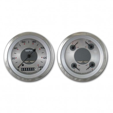 This All American 2 Gauge Set includes 3-3/8" Speedo & Quads. Features a Silver Face, Black Numbers, Polished Stainless Radial Bezel, Curved Glass Len & Black Pointers that give these gauges a classic finish for your hot rod.