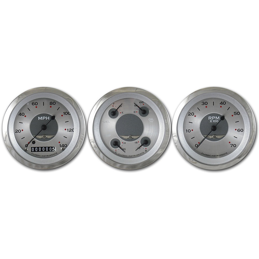 This All American 3 Gauge Set includes 3-3/8" Speedo, Tach & Quads. Features a Silver Face, Black Numbers, Polished Stainless Radial Bezel, Curved Glass Len & Black Pointers that give these gauges a classic finish for your hot rod.