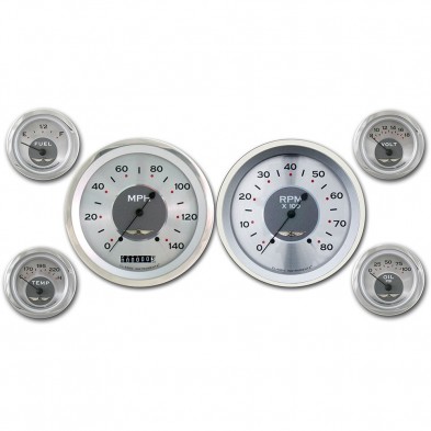 This All American 6 Gauge Set includes 4-5/8" Speedo, Tach & 2-1/8" Fuel, Oil, Temp & Volts. Features a Silver Face, Black Numbers, Polished Stainless Radial Bezel, Curved Glass Len & Black Pointers that give these gauges a classic finish for your hot rod.