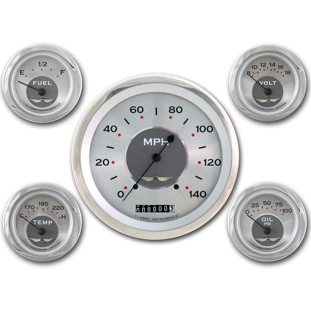 This All American 6 Gauge Set includes 4-5/8" Speedo & 2-1/8" Fuel, Oil, Temp & Volts. Features a Silver Face, Black Numbers, Polished Stainless Radial Bezel, Curved Glass Len & Black Pointers that give these gauges a classic finish for your hot rod.