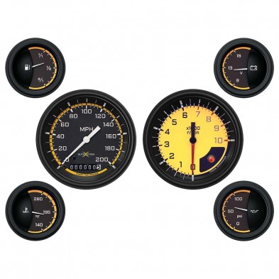 This Auto Cross Yellow 3-3/8" Speedo, Tack & 2-1/8" Fuel, Oil, Temp & Volt gauges. Features a Yellow & Black Face, White Numbers, Low Step Black Bezel, Flat Glass Lens & Whie & Red/Black Pointers that give these gauges a classic finish for your hot rod.