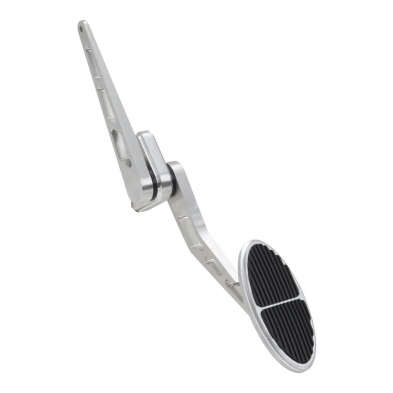 The oval billet aluminum throttle pedal is spring-loaded with a removable lower arm that is splined for versatility and can be mounted to the right or left of the mounting bracket. The shaft and arm are one piece – requiring no pins. Rubber inserts provide foot traction for safety.