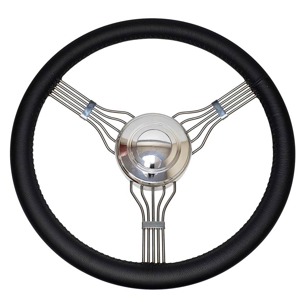 This is a affordable Banjo Steering Wheel that is made for Yogi's. This is a beautiful combination of traditional styling and modern machining. This one piece wheel is built into a machined GM column adapter. Accommodates any Lecarra Style horn buttons. This 15" Banjo style steering wheel has 1-1/2" less dish allows for more drivers comfort. Please note this steering wheels grip is covered in Black Leather and plain smooth horn button.