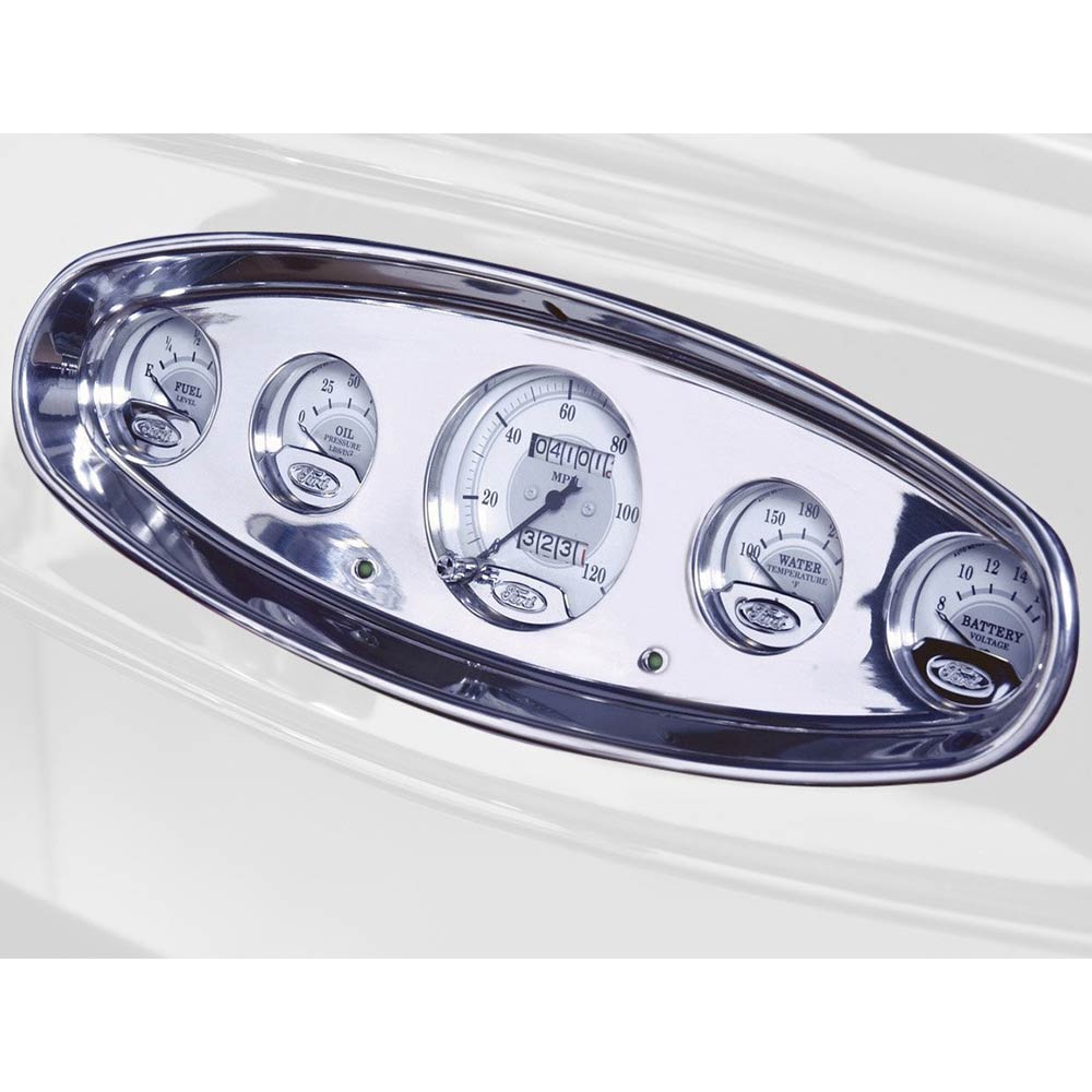 The Oval Billet Aluminum Dash Insert features a recessed face design. Gauges mount from back of insert. Two green 12 volt turn signal LEDS and one red 12 volt high beam LED included. Holding clips and screws included. Gauges not included.