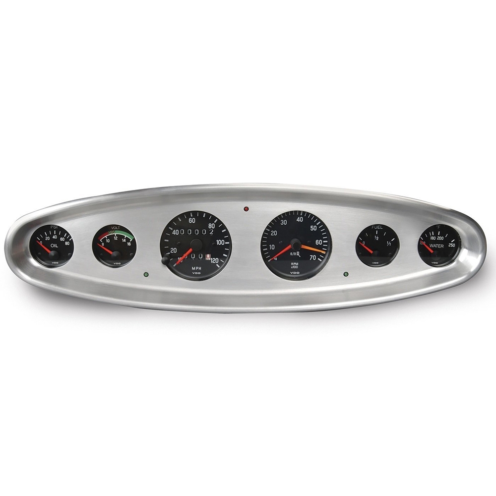 The Oval Billet Aluminum Dash Insert features a recessed face design. Gauges mount from back of insert. Two green 12 volt turn signal LEDS and one red 12 volt high beam LED included. Holding clips and screws included. Gauges not included.