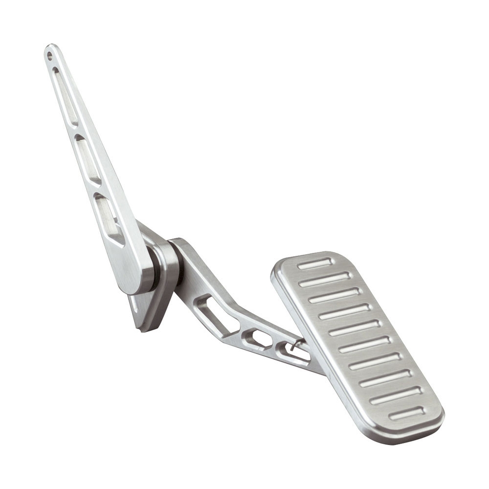 The aluminum throttle assembly has a spring-loaded pad like OEM design. It features a removable lower arm which is splined for versatility in mounting to the right or left of the mounting bracket. The upper arm is a one-piece design. The XL Series of pedals have an extra large pad for those seeking more comfort and satety.