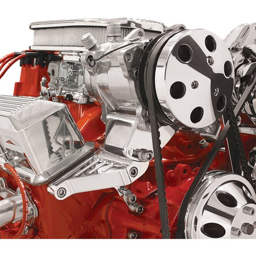 This independent compressor and alternator brackets are CNC machined from 6061-T6 billet aluminum and polished to a mirror finish. Independently adjustable without stabilizer bars for a clean look. Multipoint fastening ensures stability and belt tension.