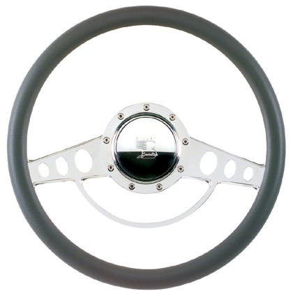Billet Specialties half wrap steering wheels are the ultimate dress up option for your special vehicle's interior! This wheel is shown with a tan leather half wrap ring and a standard size Billet Logo horn button.