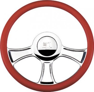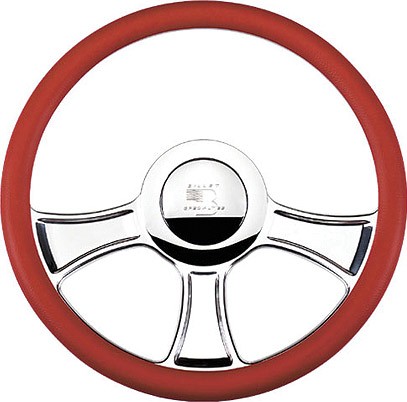Billet Specialties half wrap steering wheels are the ultimate dress up option for your special vehicle's interior! This wheel is shown with a red leather half wrap ring and a standard size Billet Logo horn button.