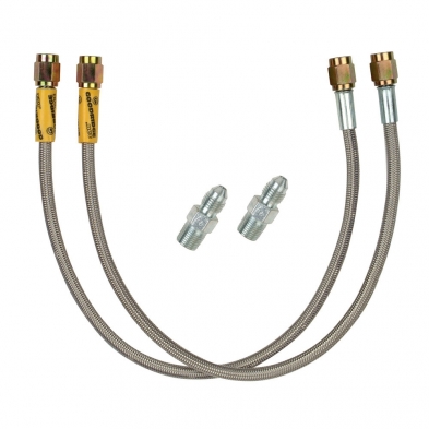 This is a Heidt's 14'' braided stainless brake line kit for Wilwood calipers. There brake lines are made of much stronger and more abrasion resistant then rubber hoses and use a -3AN fitting on the frame side. This kit includes caliper adapters and seal washers als well.