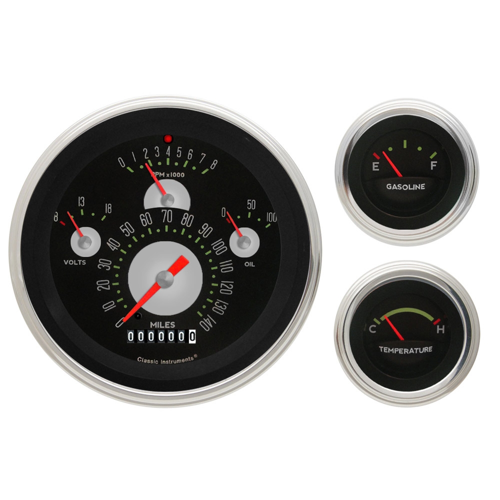1957 ChevyAuthentic Black Package 4-5/8" Speedometer 140 MPH, Tachometer 8000 RPM, Oil, & Volt 2-1/8" Fuel 0-30 Oohm & Temp with Stainless Low Step Bezel and Flat Glass Lens. Please note that the Fuel sending unit is not included as this gauge kit is calibrated to stock 0-30 ohm range.