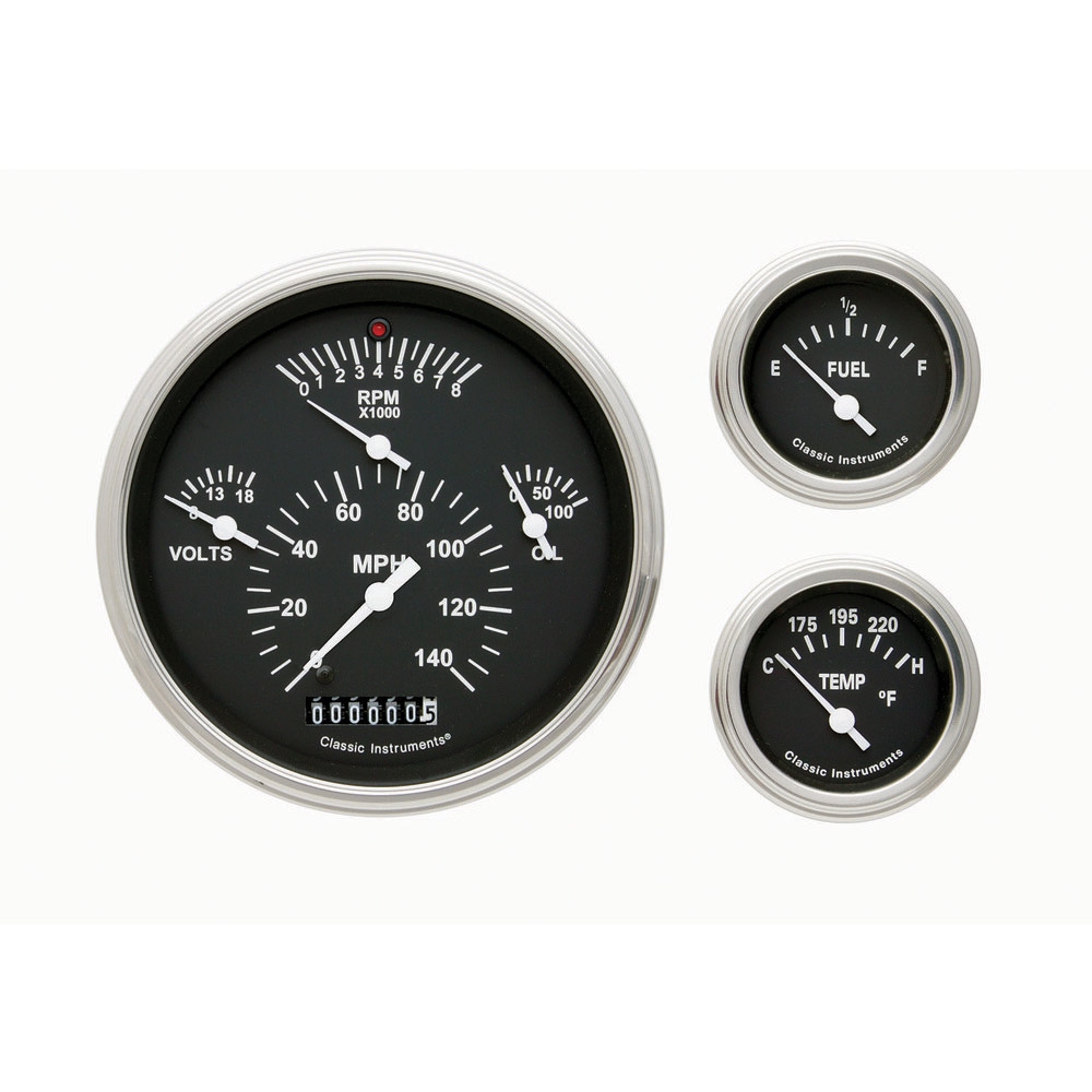 1957 Chevy Black Package 4-5/8" Speedometer 140 MPH, Tachometer 8000 RPM, Oil, & Volt 2-1/8" Fuel 0-30 Oohm & Temp with Stainless Low Step Bezel and Flat Glass Lens. Please note that the Fuel sending unit is not included as this gauge kit is calibrated to stock 0-30 ohm range.