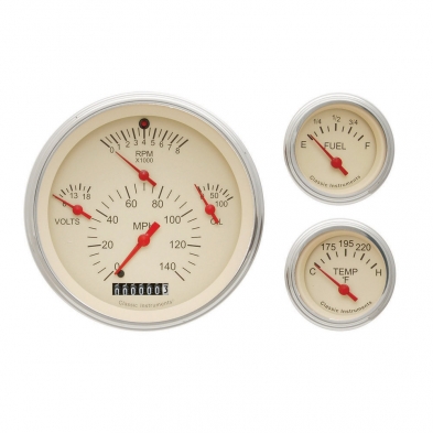 1957 Chevy Tan Package 4-5/8" Speedometer 140 MPH, Tachometer 8000 RPM, Oil, & Volt 2-1/8" Fuel 0-30 Oohm & Temp with Stainless Low Step Bezel and Flat Glass Lens. Please note that the Fuel sending unit is not included as this gauge kit is calibrated to stock 0-30 ohm range.