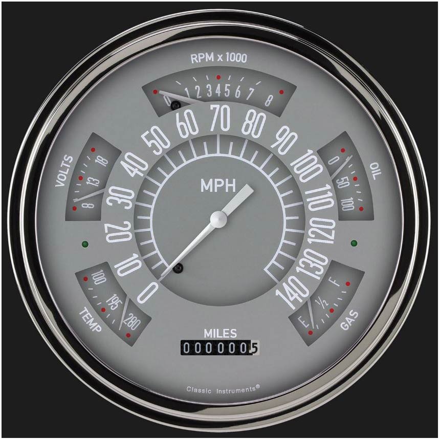 The 1949-50 Chevy Gray Package features the speedometer, tachometer, fuel, temperature, volt, and oil gauges all in one direct fit instrument. Installing the all-electronic cluster is easy with the included mounting hardware, Classic Instruments Zeus Speedometer Technology for push button calibration and all the included sending units.