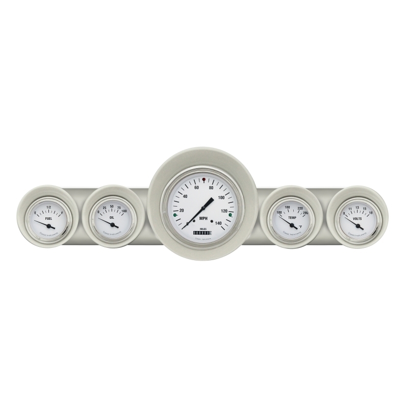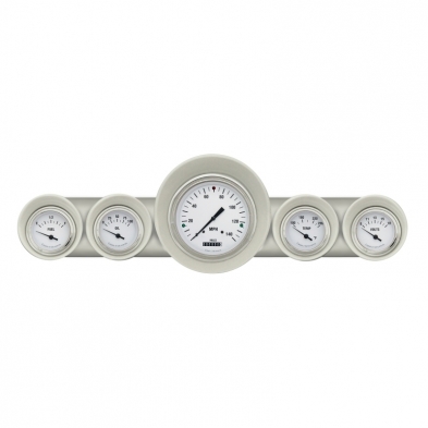 1959-60 Full Size Chevy Package in White Hot design includes 4-5/8" Speedometer and 2-1/8" Fuel (0-30 ohm), Oil, Temp, Volt with Stainless Low Step Bezels.