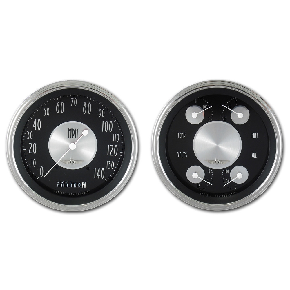The 1947-53 GM Pick-Up Package All American Tradition Series 4-5/8" Speedometer & Quad (Fuel 240-33 OHM) with Stainless Low Step Bezel Flat Glass Lens. The package includes model specific rings, mounting hardware and all sending units.