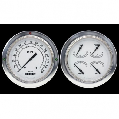 The 1954-55 Chevy Truck Package Classic White Series 4-5/8" Speedometer & Quad (Fuel 240-33 OHM) with Stainless Low Step Bezel Flat Glass Lens. The package includes model specific trim rings with LED turn signals and high beam indicator light, mounting hardware, and all sending units.