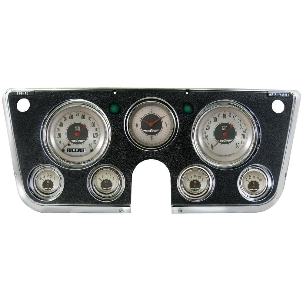 The 1967-72 Chevy Truck Package with in the All American Nickel Series installed, features a 4-5/8" Speedometer and Tachometer, 3-3/8" Clock and 2-1/8" Fuel (0-90 ohm), Oil, Temp, and Volt gauges. A blue LED high beam indicator is installed in the speedometer. The set includes pre-wired electrical connections, mounting hardware, all necessary* sending units, and a wiring harness constructed of automotive grade TXL wire, machine-crimped terminals, tech-flex sleeving, and Molex main connectors. It is equipped with their ZST.