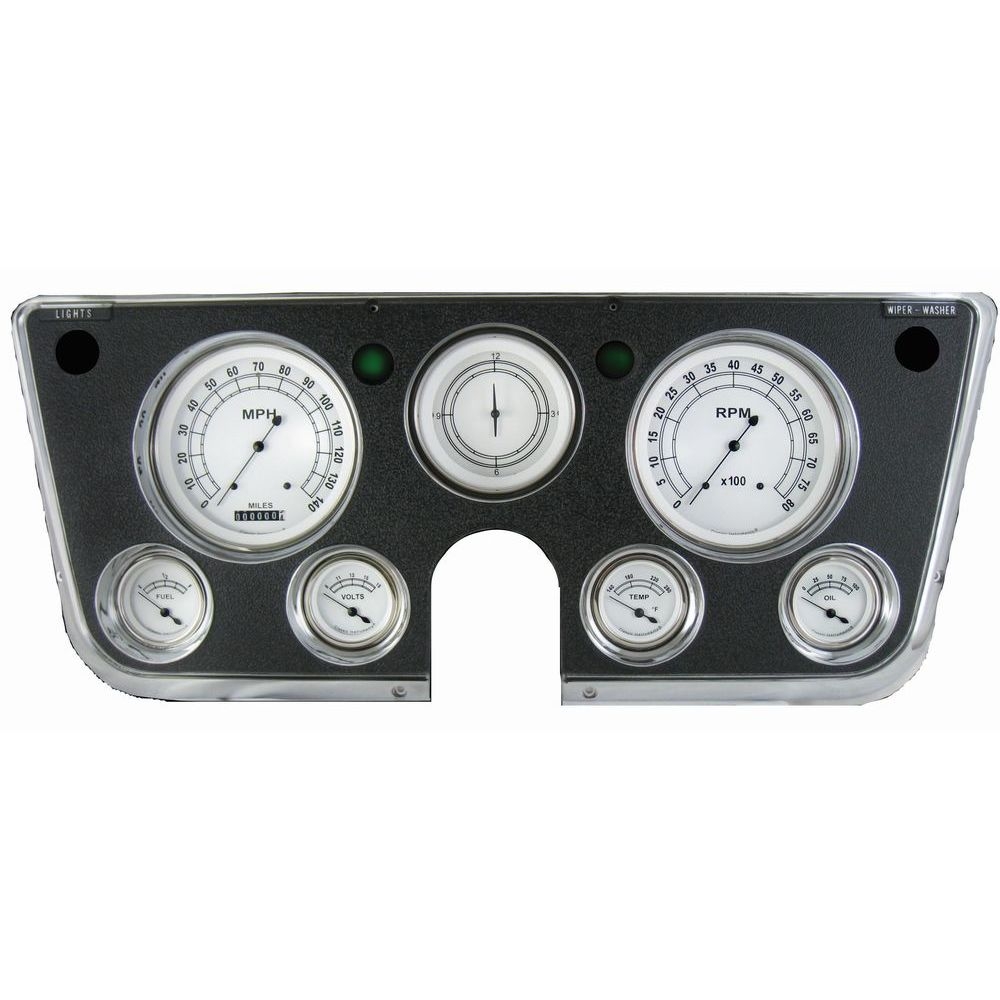 The 1967-72 Chevy Truck Package with in the Classic White Series installed, features a 4-5/8" Speedometer and Tachometer, 3-3/8" Clock and 2-1/8" Fuel (0-90 ohm), Oil, Temp, and Volt gauges. A blue LED high beam indicator is installed in the speedometer. The set includes pre-wired electrical connections, mounting hardware, all necessary* sending units, and a wiring harness constructed of automotive grade TXL wire, machine-crimped terminals, tech-flex sleeving, and Molex main connectors. It is equipped with their ZST.