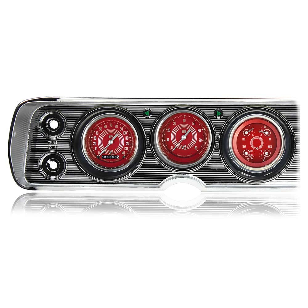 The 1964-65 Chevelle Package in the V8 Red Steelie Series. Features include a 140 MPH Speedometer with blue Halo high beam indicator, 8,000 RPM Tachometer and Quad (Fuel 0-30 OHM, oil, temp, and volt gauges). It comes with complete wiring harness constructed of automotive grade TXL wire, machine-crimped terminals, tech-flex sleeving, and Molex main connectors. Also includes all necessary sending units*, mounting hardware and an adapter panel for easy installation into your existing** bezel.