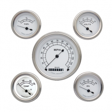 The Classic White 5 Gauge Kit includes: The 3-3/8" Speedo, 2-1/8" Fuel, Oil, Temp and Volt with Stainless Low Step Bezel Curved Glass Lens.